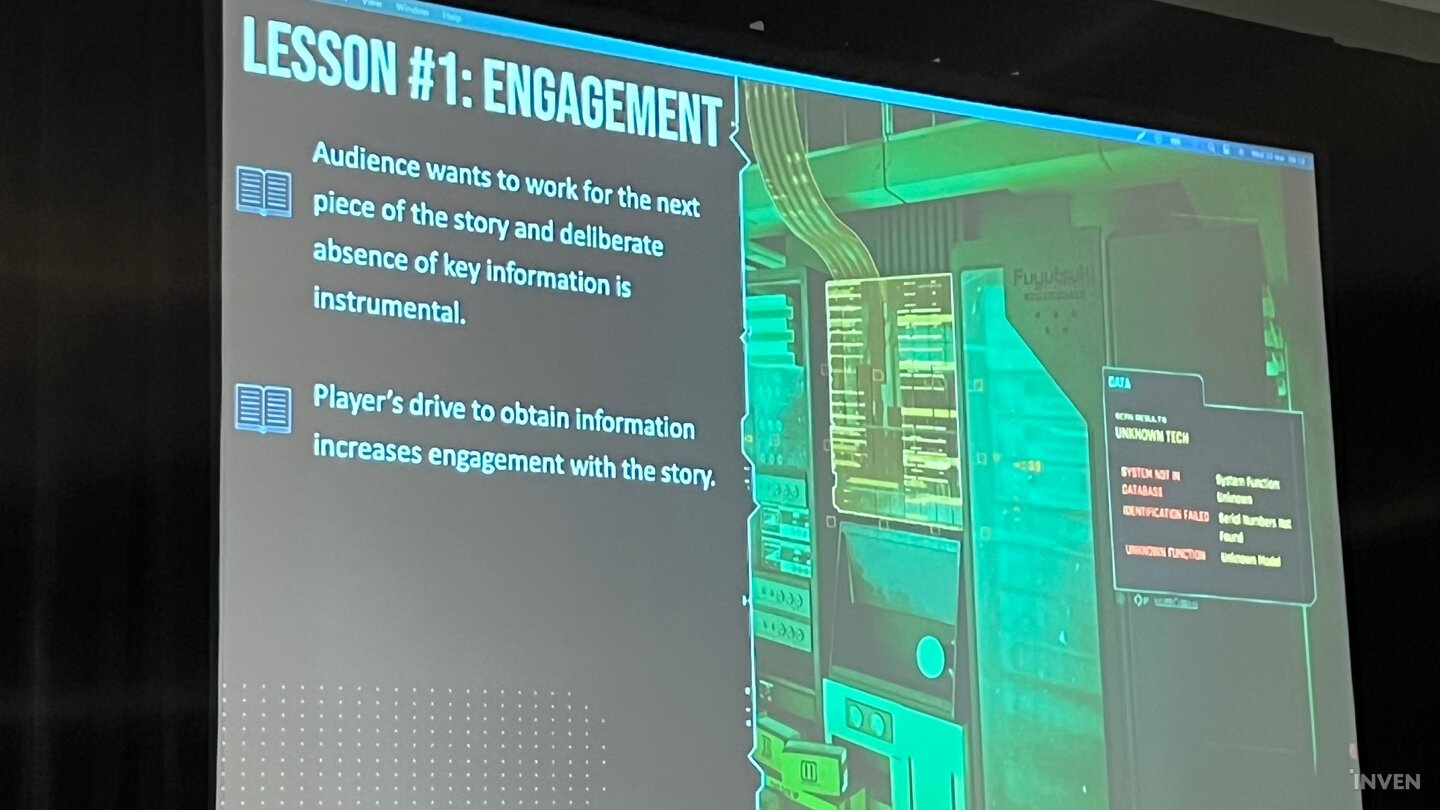 이때 게임사가 플롯과 동선을 짜는 과정에서 유저의 그러한 행동에 맞춰 정보를 제공해주지 않으면 실제로 그 세계 속에서 유저가 참여한다고 느끼게 하기는 어렵다. 예를 들어 사이버펑크 2077에서는 스캔이 가능한 만큼, 자연히 유저는 사방을 스캔하면서 단서를 찾고자 한다. 그때 결정적인 단서가 쉽게 노출이 되어버리거나 정반대로 어떤 정보도 없으면 유저의 적극적인 참여를 끌어내기 어렵다. 이런 점까지 고려해서 플롯과 퀘스트 동선을 맞춰나가는 작업이 필요했다.
