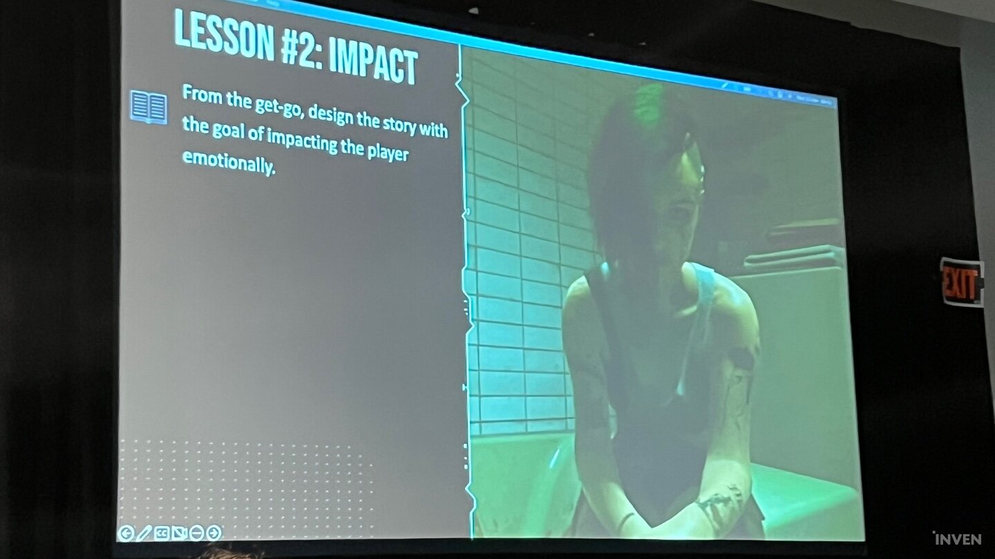 이것만으로는 유저의 관심을 끌어오기 어려운 만큼, ‘임팩트’를 어느 시점에 어떻게 넣어야 할지도 고민해야만 했다. 사이버펑크 2077에서 이블린이 죽은 뒤 주디의 가슴이 미어지는 상황이라는 것을 스토리뿐만 아니라 연출에서도 효과적으로 보여줄 장치가 필요했다. 플롯 작성 단계에서는 슬퍼한다는 정도만 언급됐지만, 게임 화면에서는 그대로 연출했을 때 밋밋한 느낌이었기 때문이었다. 이를 보여주기 위해 주디가 눈물을 흘리는 장면을 화장이 번지면서 검은색 눈물이 나오게끔 수정, 시각적인 임팩트를 통해 주디의 감정과 상황을 유저에게 좀 더 확고하게 보여주는 장면이 됐다. 위쳐3에서 시리가 각성하는 장면은 ‘인생의 전환점’이라는 것을 어떻게 확실하게 인지시킬지 고민해서 만들어낸 결과물이었다.