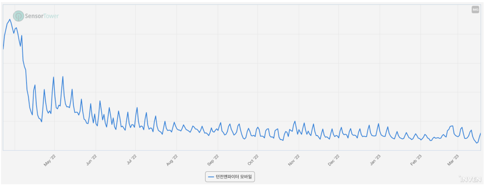 센서타워 데이터로 ‘던파모바일’ 추정 매출과 추정 이용률 변화를 조사했다. 센서타워는 모바일 데이터 분석 업체다. 센서타워가 제공하는 성과 지표는 신뢰받아 외신 블룸버그, 로이터, 뉴욕타임즈 등이 사용한다.