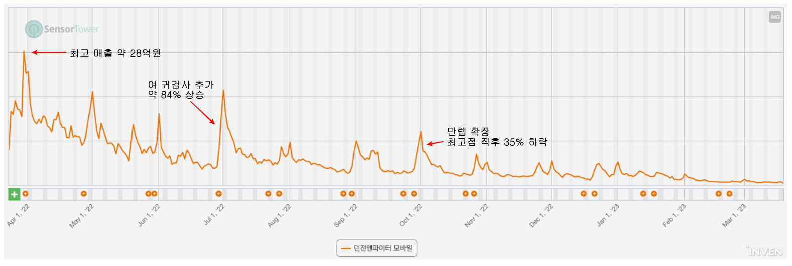 ‘던파모바일’ 매출과 이용률은 출시 직후 가파르게 상승해 최고점을 찍은 뒤, 하향안정화 추세를 보였다. ‘던파모바일’은 3월 29일 추정 매출 28억 원으로 최고점을 찍었다. 하향안정화 기간 다양한 업데이트를 통해 매출과 이용률 반등은 있었으나, 역주행 결과를 만들진 못했다.