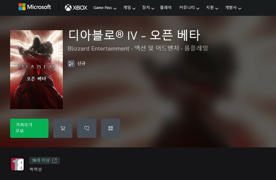 Xbox One/Xbox 시리즈 X|S 플랫폼을 활용할 경우에도 방식은 비슷하다. Xbox 공식 홈페이지에서 ‘디아블로® IV – 오픈 베타’ 항목을 찾아볼 수 있으며, 활성화된 ‘가져오기 무료’ 버튼을 누르면 오픈 베타 참여 준비가 완료된다. 이후 설치 위치를 특정하고 사전 설치를 진행하게 되는 식이다.