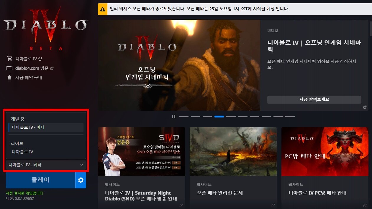 25일부터 시작되는 베타 테스트를 손꼽아 기다리고 있는 유저라면, 금일(23일)부터 시작된 베타 버전 사전 다운로드를 주목하자. 현재 배틀넷 클라이언트를 열고 게임 버전 항목에서 ‘개발 중 – 디아블로4 베타’를 선택하면 다가오는 주말부터 시작되는 디아블로4의 OBT 빌드를 미리 자신의 PC에 설치해둘 수 있다. 베타 빌드의 크기는 85.20GB이며 전체 설치까지 약 30분 가량의 시간이 소요될 수 있으므로, 베타 서비스 오픈과 함께 ‘오픈런’을 생각하고 있는 게이머라면 꼭 준비해둬야 하는 부분이라고 할 수 있다.
