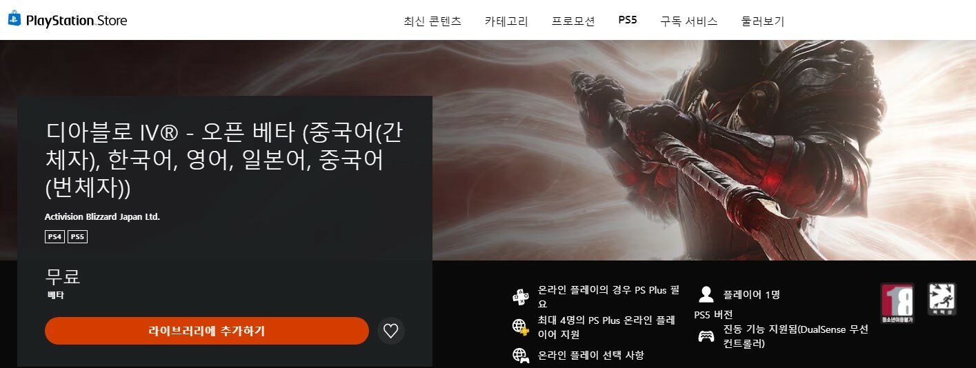 PS4와 PS5, Xbox One/Xbox 시리즈 X|S 플랫폼으로 베타에 참여할 수도 있다. PS 플랫폼을 활용할 경우 PS 스토어를 통해 ‘디아블로 IV® – 오픈 베타’를 라이브러리에 추가하면 된다. 이후 자신의 라이브러리를 확인하면 베타 클라이언트를 다운로드할 수 있다.