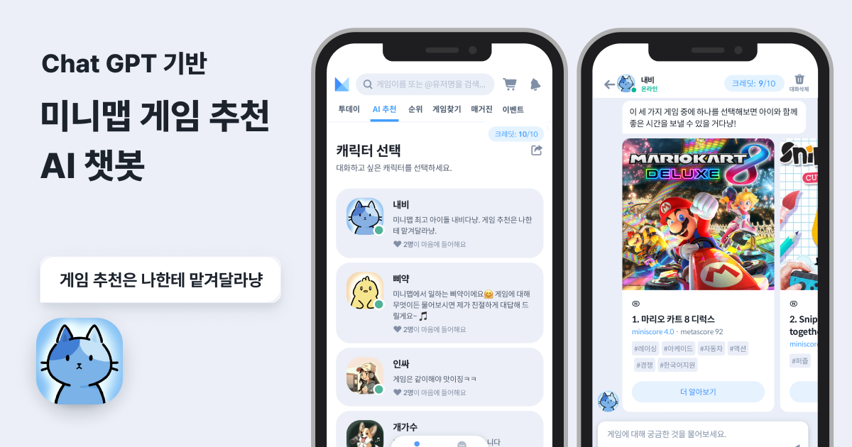 미니맵 AI 추천 챗봇은 취향과 주제에 따른 다양한 캐릭터들로 구성되어 있는 것이 특징으로, 주제와 취향에 따라 캐릭터를 골라 대화할 수 있다. 미니맵 대표 캐릭터인 ‘내비’, 인디 게임을 좋아하는 ‘인디’, 흔치 않은 게임을 골라 추천해주는 ‘마스터’ 등 현재 총 7개의 캐릭터와 대화를 나눌 수 있다.