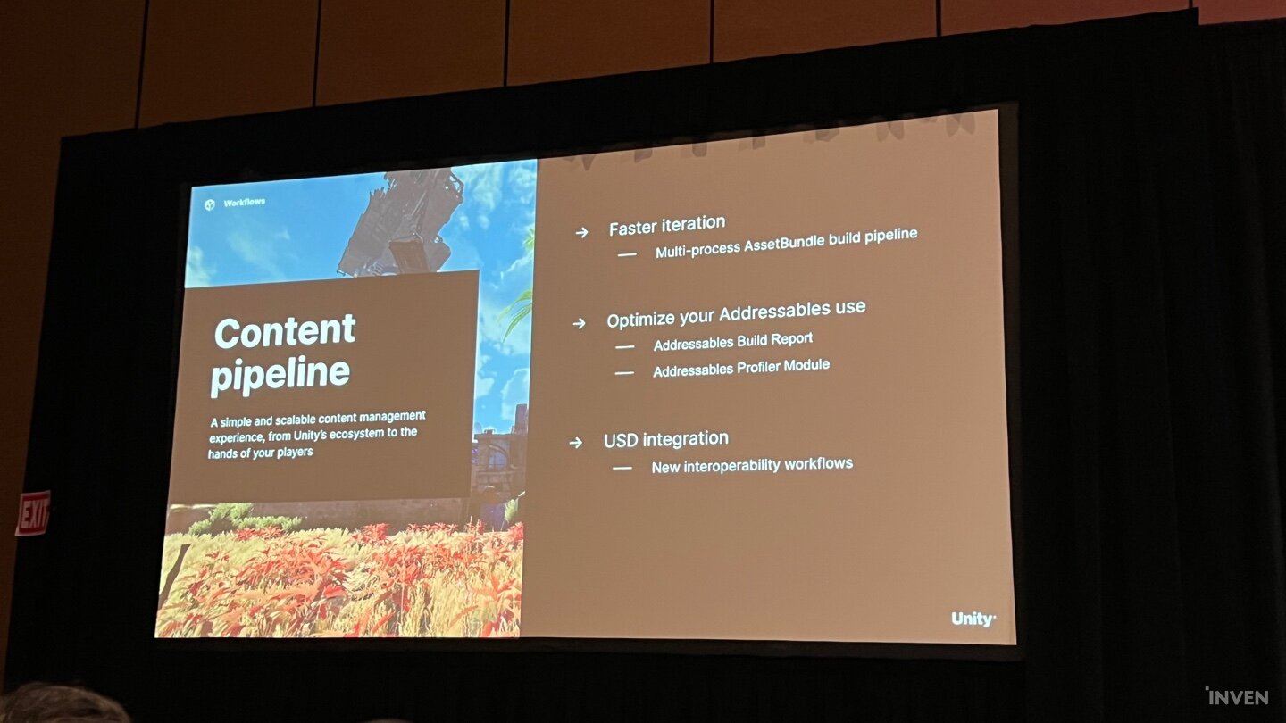 사이먼 볼 매니저는 유니티 발전 방향에서 가장 중요한 점으로 콘텐츠 파이프라인을 꼽았다. 한때 유니티가 싱글 코어 위주였던 적이 있으나, 더 빠르고 확실한 반복처리 작업을 위해 멀티 프로세스 애셋 번들 역시도 파이프라인을 구축하기 시작했다. 또한 빌드 리포트나 프로파일러 모듈도 단순히 산정되는 것을 넘어서, 유니버설 씬 디스크립션(Universal Scene Description)으로 새롭게 상호 운용이 가능한 워크플로우를 구측하는 등 변화가 일었던 것이다. 이와 같은 일련의 과정의 궁극적인 목표는 게임 개발에서 계속 반복되는 작업은 빠르게 처리하고, 그러면서 게임에서 로딩뿐만 아니라 빌드 과정과 에디팅 과정도 가속화했다.