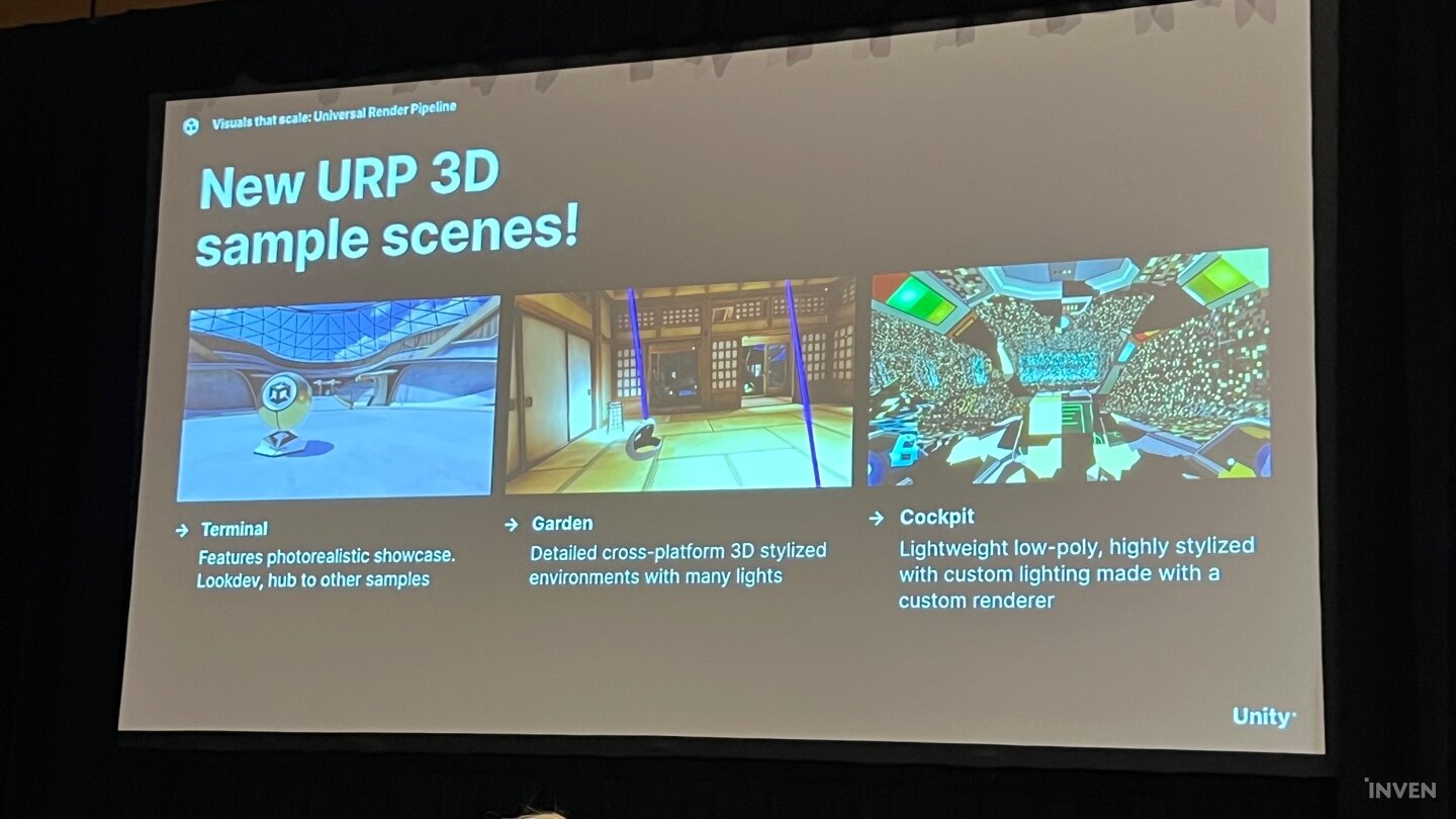 이밖에도 고퀄리티 리얼타임 라이팅을 플랫폼 내에 광범위하게 적용하는 데칼 레이어, MSAA, FXAA, SMAA 등 계단 현상을 방지하기 위한 안티 에일리어싱 기술도 각각 유니티 2022LTS와 2023.1 버전에서 적용된다. 이러한 그래픽 기술의 변화에 대해서는 실사에 가까운 그래픽을 보여주기 위한 ‘터미널’ 데모, 크로스 플랫폼 환경에서 여러 종류의 빛이가득한 환경에서 그래픽 처리능력을 선보이는 ‘가든’ 데모, 경량급 디자인계 게임에서 커스텀화된 라이팅과 렌더러의 여러 면모를 보여주는 ‘콕핏’ 데모까지 다양한 데모가 제공될 예정이다.