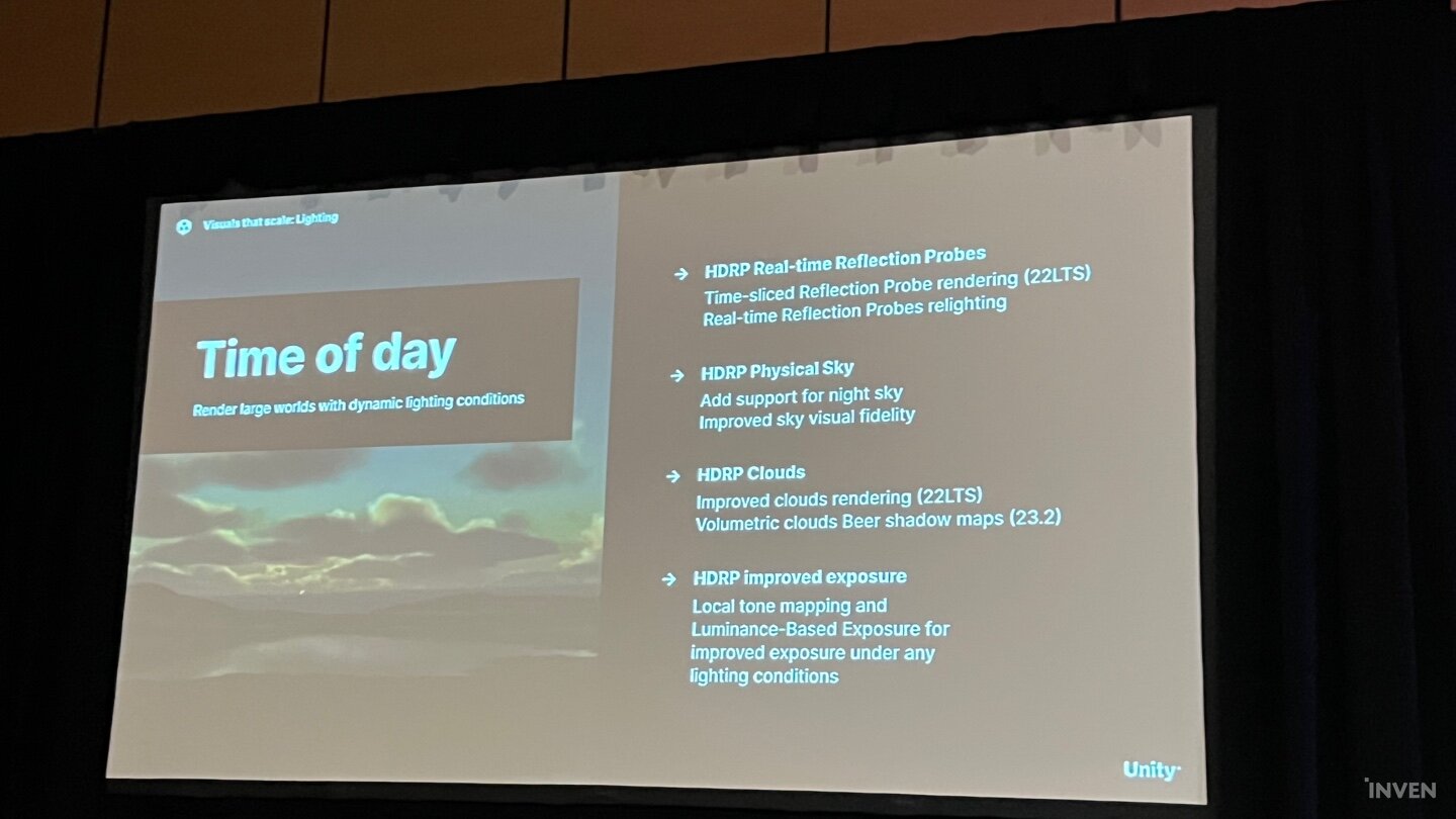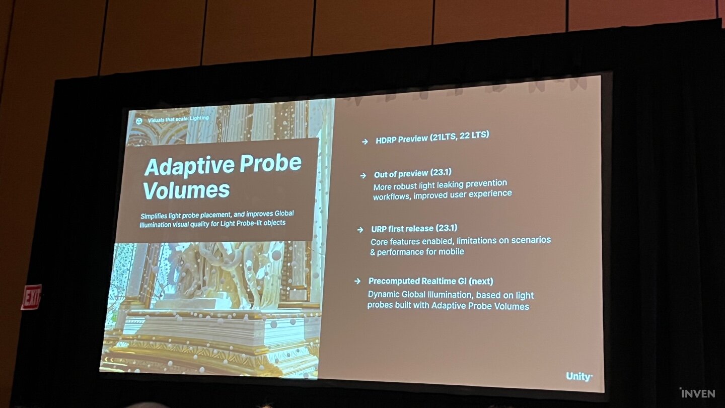여기에 라이트 베이킹의 과부하를 줄여주는 새로운 베이킹 아키텍처가 유니티 2023.1 버전에 추가가 예고된 가운데 베이크된 라이트맵 및 라이트 프로브를 생성하기 위해 컴퓨터의 GPU와 전용 비디오 램(VRAM)을 사용하는 프로그레시브 GPU 라이트매퍼와 실시간으로 반사광을 연출해내는 어댑티브 프로브 볼륨, 레이 트레이싱까지 더해진 일교차 표현까지 2022LTS와 2023 테크스트림을 통해 검증해나가는 것이 유니티의 로드맵이었다.