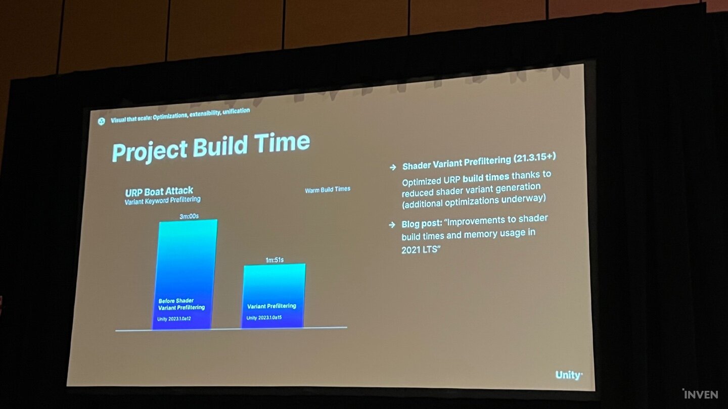 뒤이어 무대에 올라온 마티외 뮬러 그래픽 매니저는 유니티의 향상된 렌더링 퍼포먼스 및 빌드 타임 등 효율성의 업그레이드에 대해서 논했다. 유니티 2022 LTS 버전에서는 다이렉트X12 호환이 프리뷰 단계에서 벗어날 예정이며, 여기에 CPU의 멀티스레딩을 가속화하기 위한 스플릿 그래픽 잡까지 채택된다. 레이트레이싱 또한 프리뷰 단계에서 벗어나 본격적으로 적용되며, 정식 적용 전에 안정성 및 퍼포먼스 등 다양한 측면에서 검증이 진행될 예정이다.