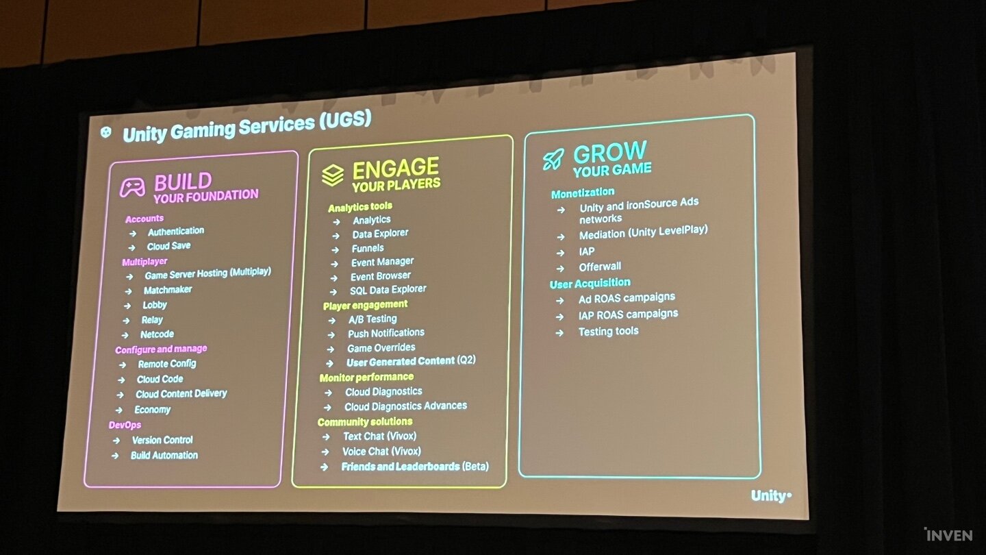 최근 멀티플레이 게임에 대한 개발자들의 관심이 높아진 만큼, 유니티에서는 단순히 엔진 내에서 지원하는 차원을 넘어 멀티플레이 게임의 전반적인 과정에 대해 지원할 수 있는 ‘유니티 게이밍 서비스’를 지난 2021년부터 선보였다. 이는 게임을 어느 플랫폼에서 퍼블리싱해주는 기존의 방식이 아니라, 기술적으로 확장가능성을 보고 그 게임사만의 특별한 인사이트를 보여줄 수 있도록 다각도로 지원해주는 형태였다.
