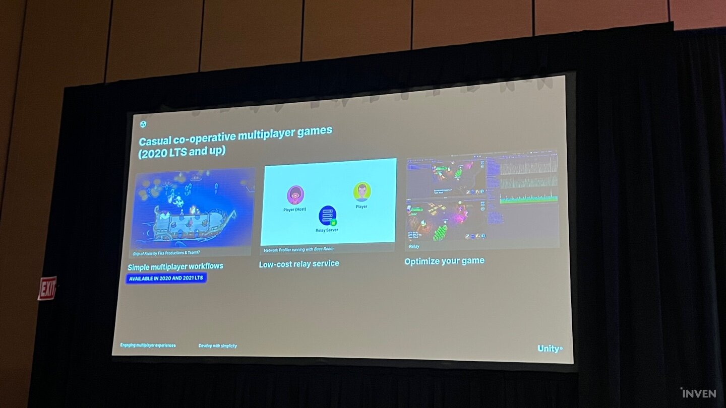 유니티에서 최근 강조하기 시작했던 멀티플레이 게임 관련한 내용도 언급됐다. 우선 유니티에서는 2020LTS 버전 이후부터 캐주얼한 협동형 멀티플레이 게임에 대한 사례를 본격적으로 언급하는 한편, 그들이 채택했던 간단한 멀티플레이 워크플로우와 저코스트로도 충분히 가능한 커뮤니케이션 서비스, 그리고 게임을 구동하면서 랙 및 여러 지표를 볼 수 있는 시각화 관련 자료를 어필해왔었다.
