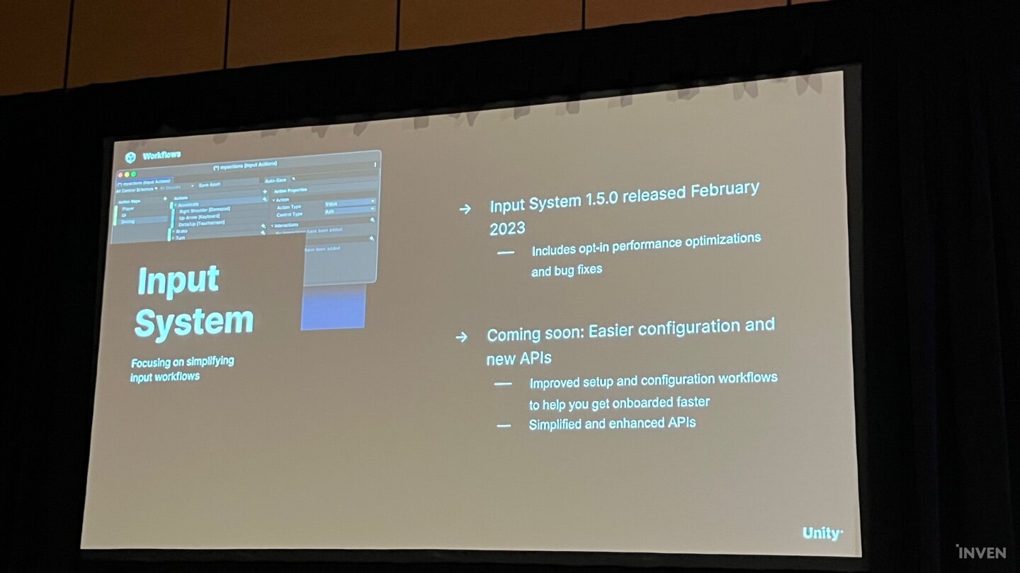 지난 유나이트 2022에서 예고된 인풋 시스템의 개선에 대해서도 추가로 언급됐다. 지난 2월 출시된 인풋시스템 1.5는 옵트인 성능 최적화 및 버그픽스를 거칠 예정이며, 더 쉬운 인풋 컨피겨레이션 및 새로운 API 도입도 준비 중에 있다.
