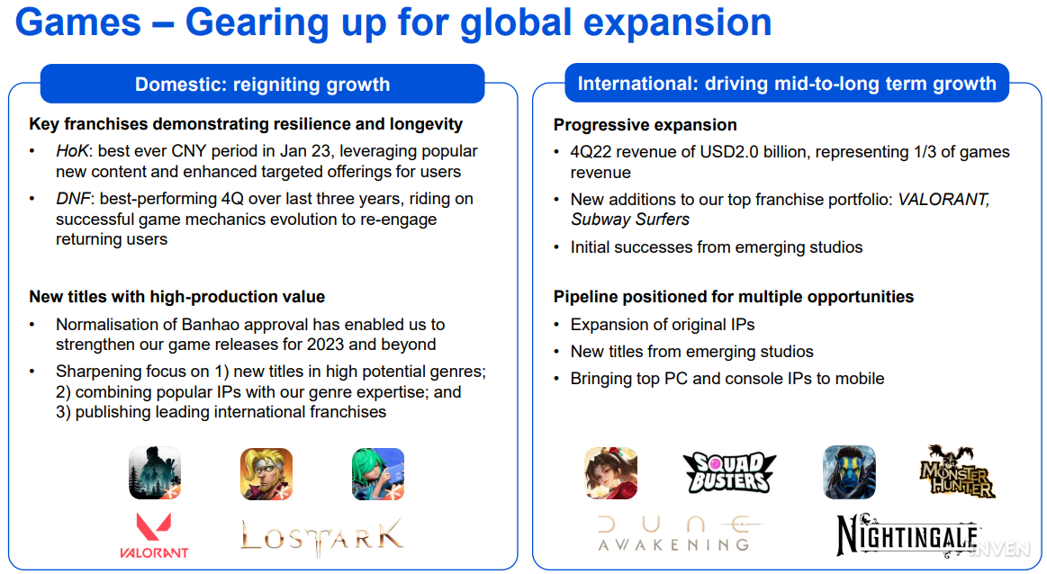 텐센트는 2022년 게임사업에 대해 “업계를 선도하는 미성년자 프로그램을 시행하여, 미성년자의 게임 이용 시간을 크게 줄였다”라며 “그러면서도 ‘왕자영요’ 이용률이 성장하고 춘절 연휴 기간 역대 최고 매출을 달성하는 등 시장 리더십을 유지했다”라고 총평했다. 이어 “올해 2월 자체 개발한 ‘언던’을 출시하여 서바이벌 오픈월드 크래프팅 게임 장르로 진출했다”라고 덧붙였다.