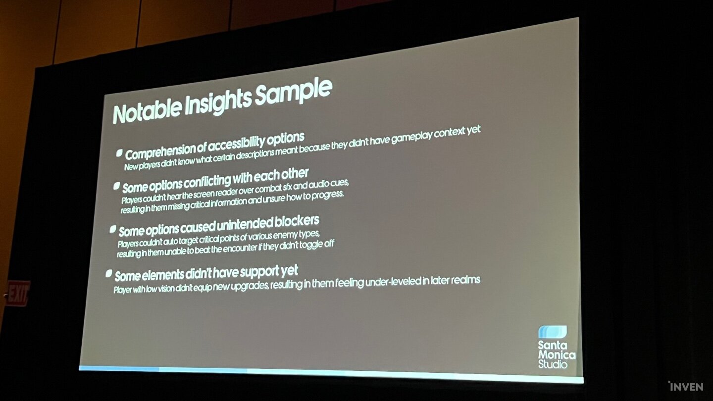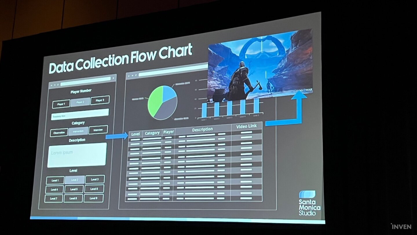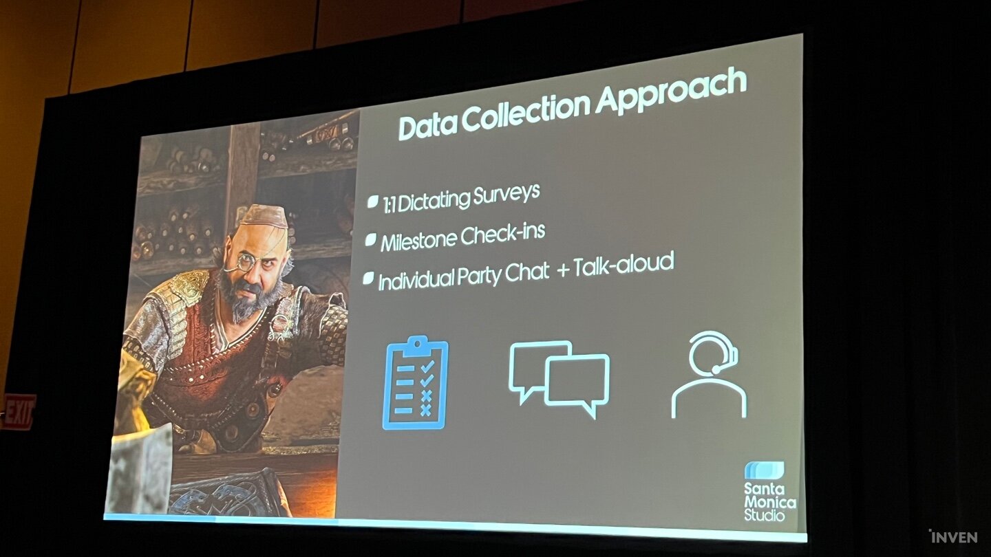 이렇게 심층적으로 테스트를 진행하기 위해서는 커뮤니티의 협조 및 전문가의 컨설팅뿐만 아니라 여러 접근성 문제를 다각도로 볼 수 있는 인원 선정에 숙박까지 다양한 문제를 해결해야만 했다. 그런 조건들이 해결된 이후에는 테스트 과정에서 유의미한 정보를 산출해서 조율하는 과정을 다각도로 고민해야했다. 단순히 전통적인 질문지 및 대면 인터뷰만으로는 경직되거나 정제된 의견 위주로 나올 확률이 있으므로, 플레이 중에 유저가 마이크를 통해 종종 다른 플레이어들과 감상을 주고 받을 때 이를 받아적는 등 앞서 언급한 기법들을 동원해 다양한 방식으로 유저의 생각을 조사해나갔다. 이 데이터를 기존에 디테일하게 작성했던 레벨 디자인과 기획 서류에 맞춰 산출, 적용해서 차트로 시각화를 한 뒤 게임플레이를 다듬어나간 것이 갓 오브 워 라그나로크의 접근성 구축 방법이었다.