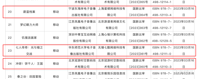 넥슨게임즈가 개발하고 서비스하는 ‘블루 아카이브'(蔚蓝档案)가 외자판호를 받았다. 데브시스터즈가 개발하고 서비스하는 ‘쿠키런: 킹덤'(冲呀!饼干人:王国)이 외자판호를 받은 것으로 추정된다. 넷마블이 개발한 ‘일곱 개의 대죄: 그랜드 크로스'(七人传奇:光与暗之交战)도 외자판호를 받은 것으로 보인다.
