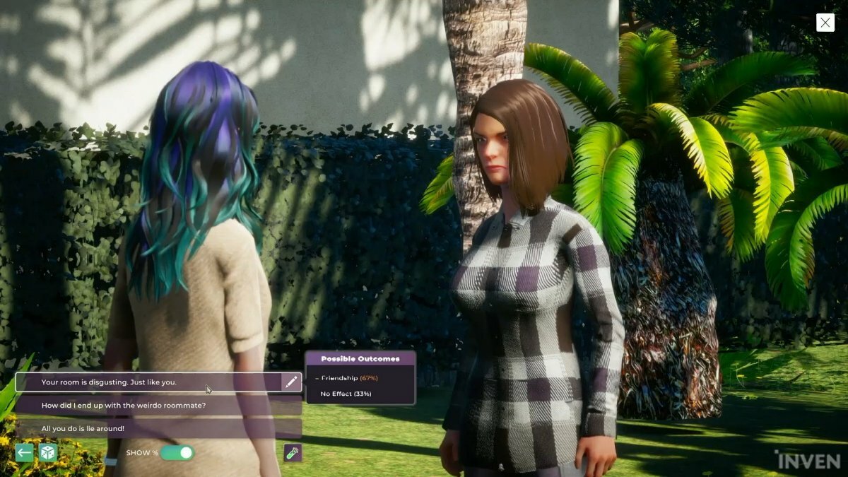 우선 캐릭터들의 대화는 누구와 이야기하고 있는지, 그 사람과의 관계, 관계의 유형, 장소 등을 통해 각기 다르게 구축된다. 또한, 대화 안에 스토리 텔링을 담아내고 무수한 선택지를 다양하게 제공해 미리 준비된 대화를 반복해서 보여준다는 느낌을 없애고자 했다. 플레이어는 캐릭터 대화 안에서 친근하게, 적대적으로, 혹은 바람을 피우는 결정까지 전적으로 자신이 원하는 방향대로 이끌어갈 수 있다.