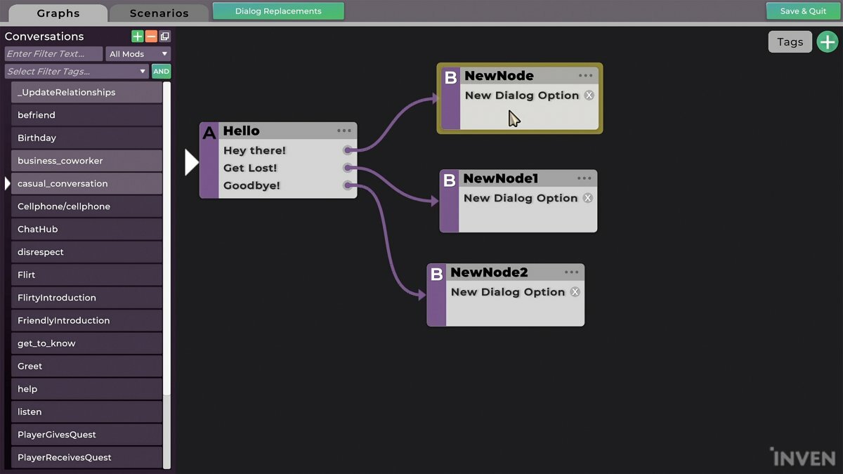 나아가 게임에 사용되는 대화를 직접 설정할 수 있는 제작 도구 역시 담긴다. 대화 자체를 편집하거나 미리 만들어지지 않은 새로운 대화를 만들 수도 있다. 대화 진행 자체도 다양한 상황을 직접 만들어 적용할 수 있고, 대화 전개 역시 드래그 앤 드롭으로 직관적으로 조작해 제작할 수 있다.
