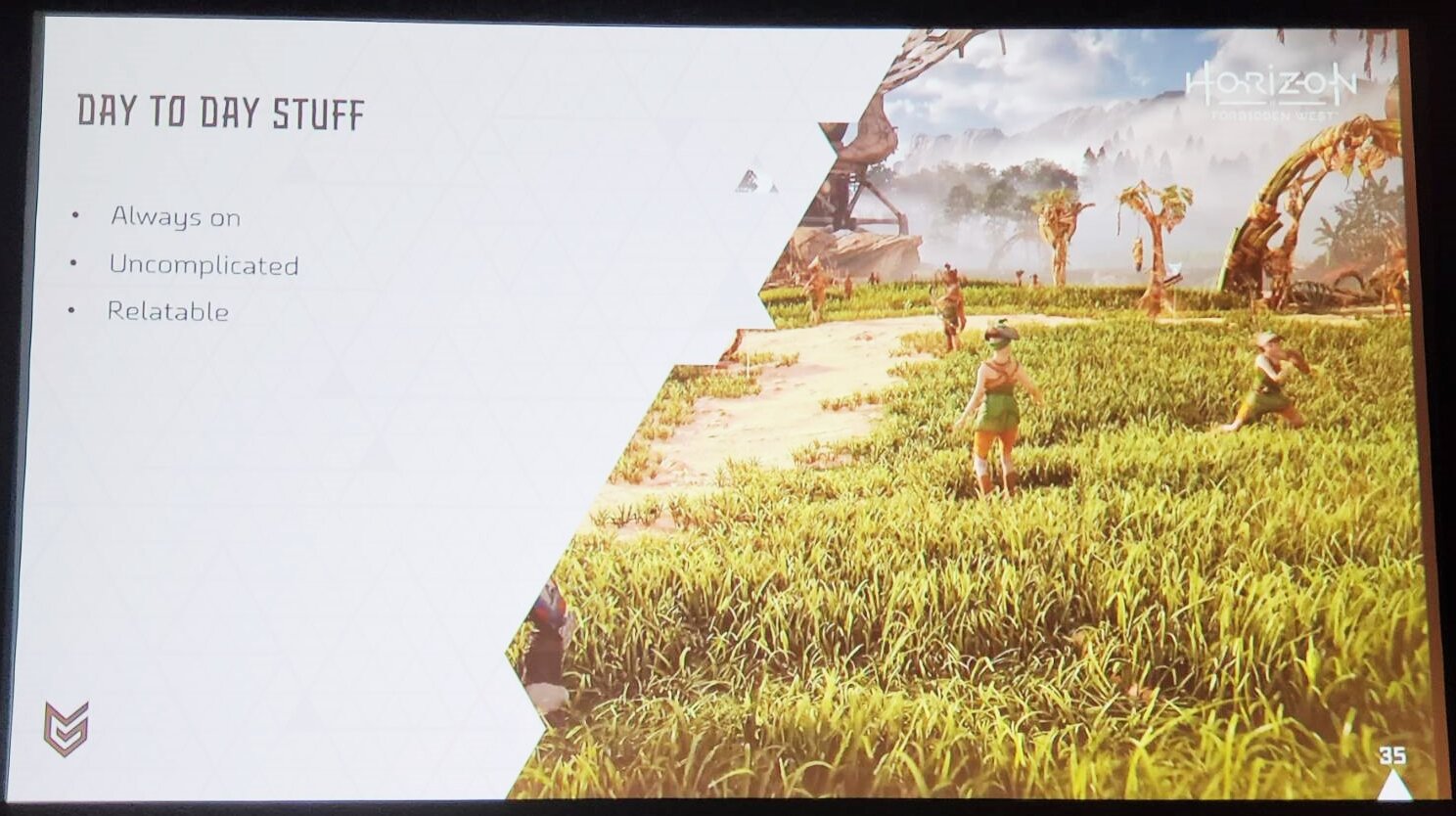 그의 직책은 살아있는 세계 팀장(Living World Designer Lead). 엔지니어와 기획자, 애니메이터로 구성된 이 팀의 역할은 오픈월드 액션 어드벤처 게임인 호라이즌 시리즈의 세계에 생동감을 불어넣는 것이다. 이는, 단순히 멋진 비주얼의 세계를 만들어내는 것을 말하지 않는다. 에스펜 손은 호라이즌 시리즈의 기둥이 되는 세 가지 요소를 말했다.