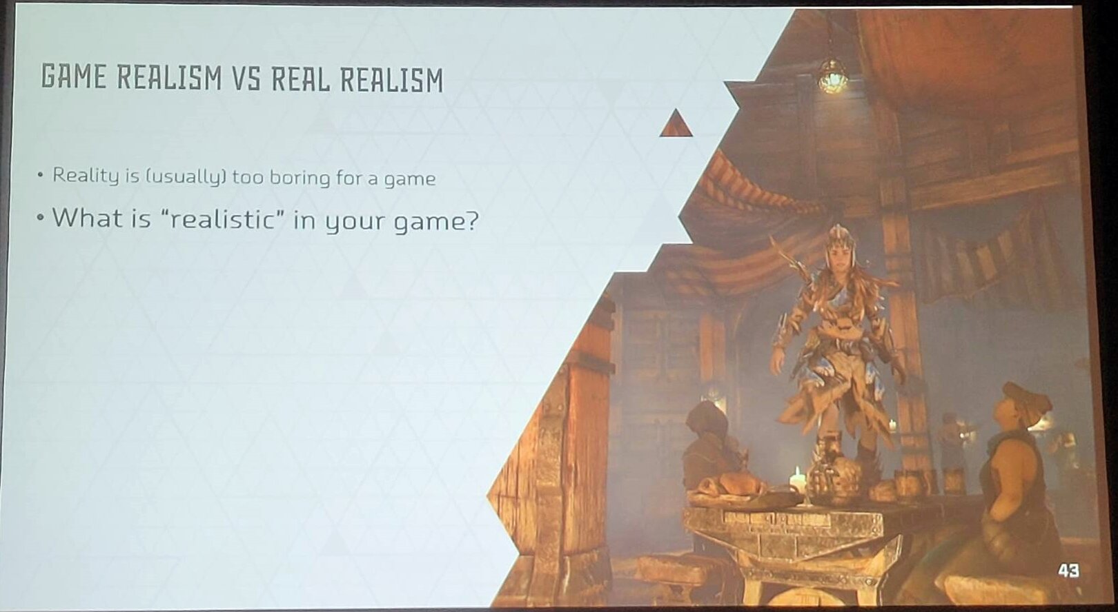 마지막으로, 그는 하나의 NPC라 하더라도 실제로 존재하는 사람을 설명하듯, 다양한 설정과 배경을 만들어주는 것이 좋다고 덧붙였다. 어떤 NPC가 자신도 모르는 분노조절장애를 앓고 있다던가, 사실은 고기를 먹지 못하는 채식주의자라던가 하는 자잘한 설정과 측면들은 게임 내에서 직접적으로 드러나지 않을 수도 있지만 서사의 일각에서, 혹은 다른 NPC와의 연계된 무언가에서 게임에 깊이를 더해주는 감초가 될 수 있음을 강조하며, 에스펜 손은 강연을 마쳤다.
