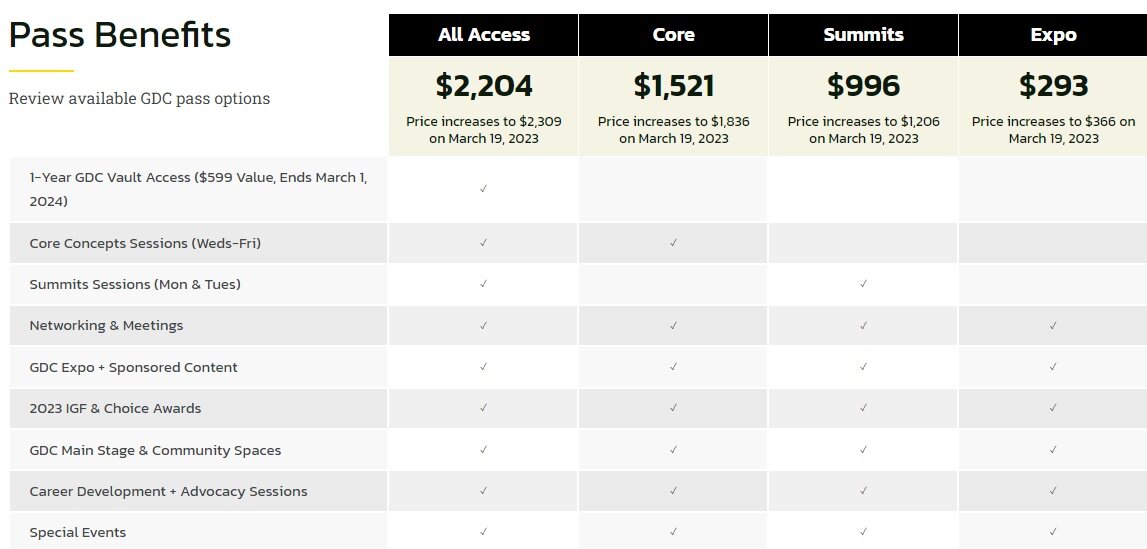 ‘GDC 2023’의 패스는 네 가지로 구분되어 있습니다. 모든 강연과 1년치 볼트(강연 녹화본)을 볼 수 있는 ‘올 억세스’가 있고, 수요일부터 금요일까지만 들을 수 있는 코어 패스, 월요일과 화요일 강연을 들을 수 있는 서밋 패스, 마지막으로 엑스포 패스로 나뉘죠.