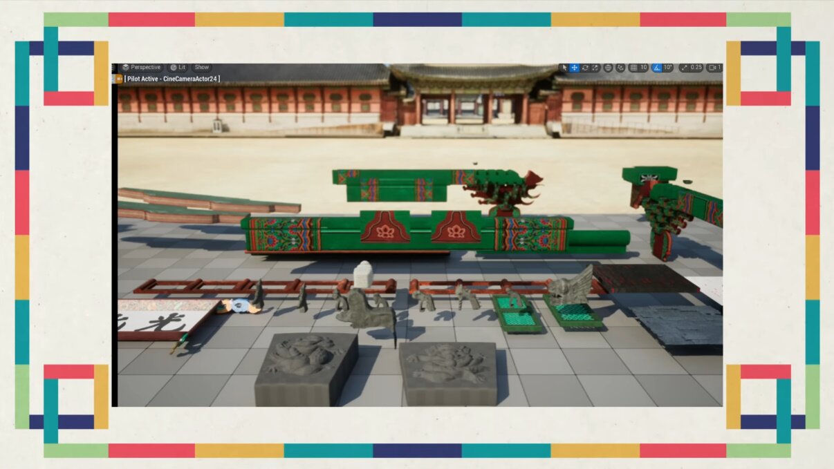 그러면서 느낀 점이라면 한옥, 문양, 그런 것들도 한국문화정보원 등에서 얻은 자료를 하나하나 살펴보고 공부하면서 만드는데 그 자료가 애매할 때가 많았어요. 참고한 자료와 동일한 시기에 만들어진 또 다른 자료를 보다보면 서로 상충할 때도 있었고, 또 시간이 지나면서 모양이 변하는 케이스도 있었죠. 어떤 부분은 자료가 없거나, 정립된 데이터가 없었어요. 예를 들자면 한옥의 문양 같은 경우에는 따로 도안이 나와 있는 것도 있는데, 그게 문서로 남아있지 않고 건축물에만 적용된 거는 그 문양을 다각도로 찍어서 하나하나 디테일을 살펴보면서 따라서 그려야 하는 문제가 있죠.