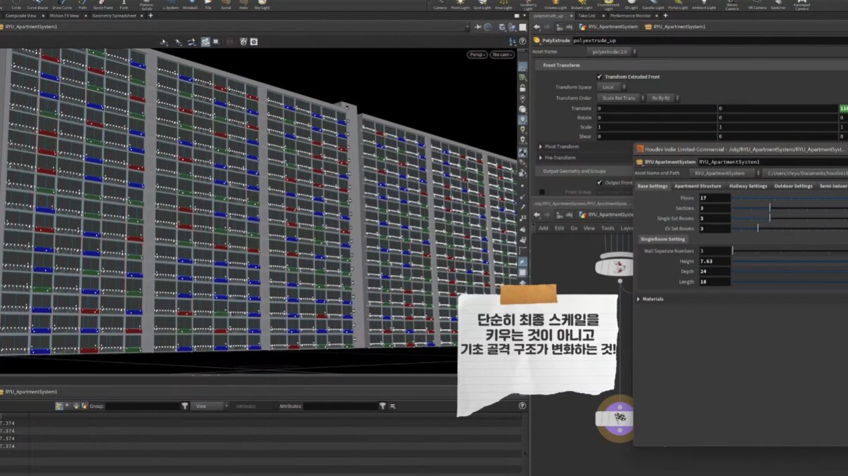 =저희 팀의 강점은 아트와 개발 인력이 같이 있다는 점입니다. 예를 들어서 아파트 같은 경우에는 그냥 단순히 3D 그래픽, 아티스트가 작업하는 그런 식이 아니었어요. 좀 더 효율적인 개발 방향을 잡고자 후디니를 활용한 파이프라인을 구축, 알고리즘을 설계했죠. 그렇게 아파트를 만드는 일련의 알고리즘을 토대로 한 칸의 넓이를 어느 정도로 하고 몇 층으로 만들 건지 등등 데이터를 입력하면 3D 데이터를 원하는 퀄리티에 맞게끔 빌드할 수 있도록 시스템을 자체적으로 구축했습니다.