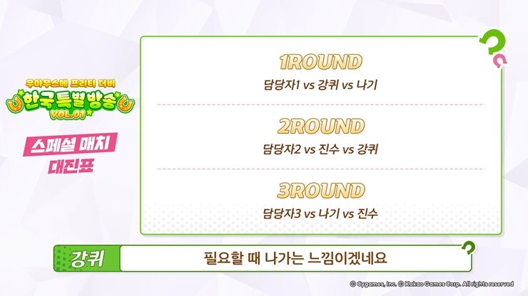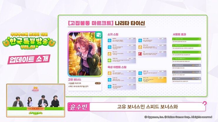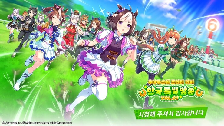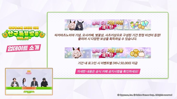 3월 15일(수) 우마무스메 공식 유튜브 채널을 통해 한국 특별 방송 VOL.1이 진행되었다. 특별 방송의 경우 앞으로 등장할 신규 우마무스메나 서포트 카드의 업데이트 소식부터 패널로 등장한 게스트들의 완벽한 분석이 들어간 다양한 TIP과 룸매치 대전이 마련되었다.