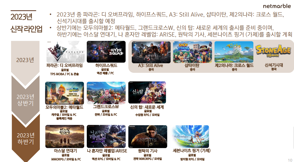 유안타증권 이창영 연구원은 “넷마블 게임 4종(A3, 샵타이탄, 제2의나라, 신석기시대)이 지난해 말 중국 판호 획득, 2023년 하반기부터 본격적으로 서비스될 예정이고, 이중 ‘제2의나라’는 텐센트가 현지화 개발/퍼블리싱할 예정이며, 이외에도 2023년 상반기 ‘모두의마블2’, ‘신의탑’, 하반기 ‘아스달연대기’, ‘나 혼자만 레벨업’ 등 이미 흥행 검증되었거나, 충성도 높은 유명 IP 기반의 게임 등 총 9종의 신규 게임이 출시될 예정이기에, 하반기 턴어라운드 가능성이 높은 상황이다”라고 분석했다.
