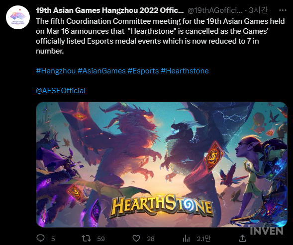 16일 아시안게임 조정위원회는 공식 SNS를 통해 하스스톤이 e스포츠 정식종목에서 취소됐다고 밝혔다. 조정위원회 측은 하스스톤을 제외한 이유를 상세히 설명하진 않았다.