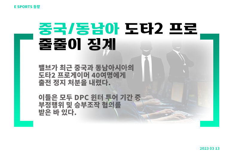 – 밸브가 최근 중국과 동남아시아의 도타2 프로게이머 40여명에게 출전 정지 처분을 내렸다. 이들은 모두 DPC 윈터 투어 기간 중 부정행위 및 승부조작 혐의를 받은 바 있다. 총 5개 팀이 아예 DPC 스프링 투어 출전 정지 처분을 받기도 했다. 이번 징계는 나이츠 소속 전원을 비롯해, 이홈 전원, 전 던 게이밍 소속 4명, 팀 미스틱 소속 4명, LBZS 소속 3명, 팀 플로우 소속 3명 등에게 내려졌다. 이들 중에 21명은 영구 정지, 25명은 1~2년 출전 정지 처분을 받았다.