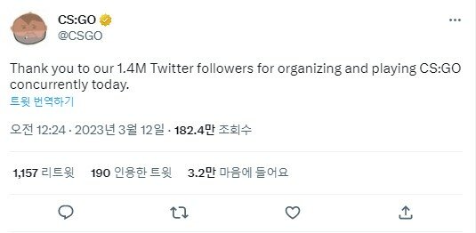 지난 12일, CS:GO의 공식 SNS에서도 이를 기념하는 게시글이 새롭게 게재됐다. 마침 CS:GO의 공식 계정을 팔로우하는 팔로워도 141만 명이므로, “CS:GO 커뮤니티를 구성하고, 게임을 플레이하는 모든 이들에게 감사한다”며 감사의 인사를 전했다.
