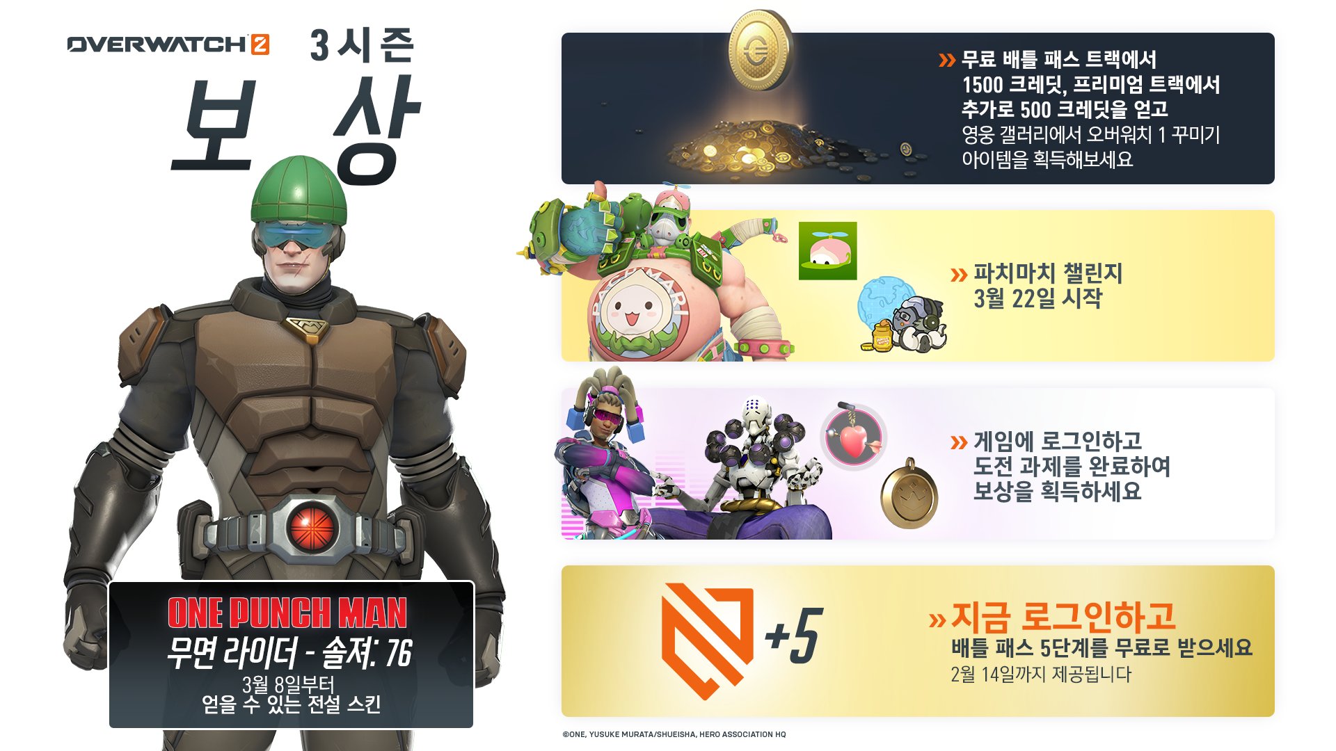 오버워치2 X 원펀맨 콜라보는 3월 8일부터 4월 6일까지 진행된다. 8일 오전 3시 55분 콜라보 트레일러를 통해 보다 자세한 소식을 공개할 예정이다.