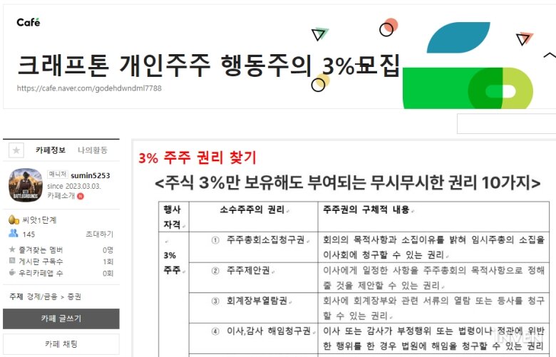 크래프톤 소액주주들이 오는 3월 28일 주주총회를 앞두고 힘을 모으고 있다. 이들의 목표는 행동주의를 실행할 수 있는 3% 모집이다.
