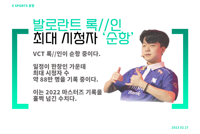– 발로란트 e스포츠인 VCT의 2023년 첫 메이저 대회인 록//인 상파울루가 순항 중이다. 현재 알파조 8강 일정을 모두 마치고 오메가조 16강 일정이 한창 진행 중인 가운데, 최대 시청자 수 약 88만 명을 기록 중이다. 이는 2022 VCT 스테이지2 마스터즈의 기록을 훌쩍 넘긴 수치다. 2022년의 마무리를 장식했던 챔피언스 당시 최대 시청자 수는 약 150만 명이었는데 이번 록//인이 이 수치를 넘길 수 있을지 주목할 만하다.