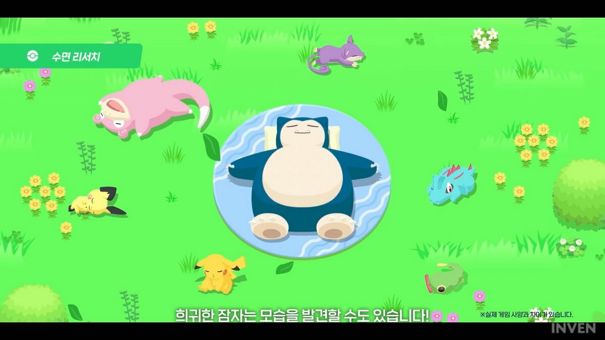 가운데 잠만보 주변으로 모여들어 잠을 자는 포켓몬들은 그 형태에 따라 다양한 모습으로 잠을 잔다. 이날 영상에서는 ‘얼간이잠’을 자는 야돈, ‘축처진귀잠’ 피카츄 등 다양한 형태로 잠자는 포켓몬을 만날 수 있다. 이용자는 그저 자고 일어나면서 다양한 포켓몬을 만나고 이를 연구하며 게임을 즐긴다.