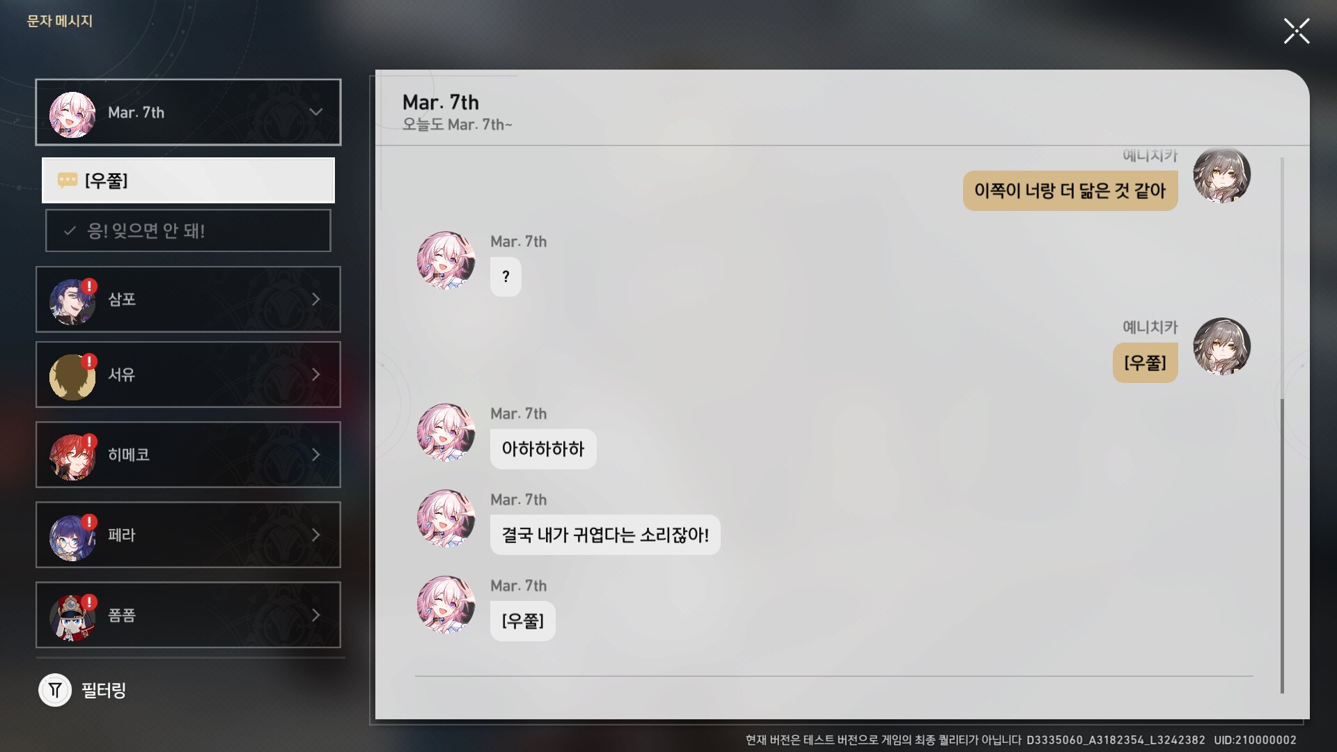 그래서 자동반복 전투 및 보상 수급처를 늘리는 것뿐만 아니라 초회 한정으로 상시 뽑기에도 천장을 달성하면 원하는 5성 캐릭터 하나는 들고 갈 수 있는 등 보완책은 마련해둔 상태입니다. 혹은 친구의 캐릭터를 빌려와서 캐리받는 그 그리고 숙제와 메인 퀘스트, 서브 퀘스트로 부족한 이야기를 채우기 위해서 저번에는 원신을 고스란히 따온 것처럼 ‘필드’가 아닌 ‘문자’에 주력한 것도 주요 포인트라고 봅니다. ‘원신’은 필드 탐사가 주가 됐지만, ‘붕괴: 스타레일’은 아무래도 그게 조금 번거로울 수 있는 요소다보니, 이야기를 풀어내기 위해 탐사는 덜어내고 캐릭터들과 다이렉트로 소통하고 텔레포트로 이동하는 비율을 높이는 식으로 조율했거든요.