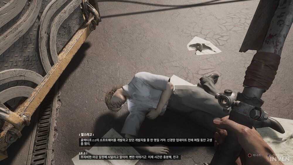 아무런 전조도 없이 발생한 이러한 버그는 여러모로 몰입을 해치고 게임의 맥을 끊을 수밖에 없었습니다. 이뿐만이 아닙니다. 자동 저장 후 죽어서 로드하는 부분이었는데 이번에는 웬걸 갑자기 소령이 맨주먹인 버그가 발생했습니다. 무기를 들려고 해도 전혀 들지 않는 상황이었죠. 전투를 아예 할 수 없으니 게임을 진행할 수 없음은 물론이고 심지어는 다음으로 넘어가기 위해서 대화해야 하는데 대화도 할 수 없었죠. 결국 이 역시 30분 정도 전으로 돌아갈 수밖에 없었습니다.