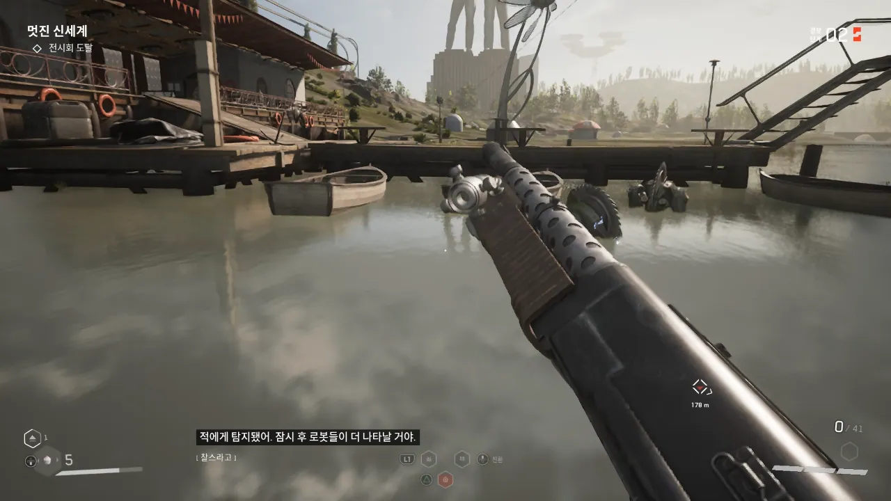 개인적으로 더 심각했던 건 이러한 오픈필드가 단순히 귀찮을 뿐 아니라 어떨 때는 짜증을 내게 한다는 점입니다. 필드 여기저기에는 플레이어를 노리는 로봇들로 가득합니다. 이거 자체는 사실 큰 문제 없습니다. 민들레라고 해서 CCTV에 걸리면 경보가 울리고 로봇들이 쏟아져나오는 것도 넘어갈 수 있습니다. 문제는 전투 지역을 벗어나지 않으면 짜증 날 정도로 전투를 치러야 한다는 점입니다.
