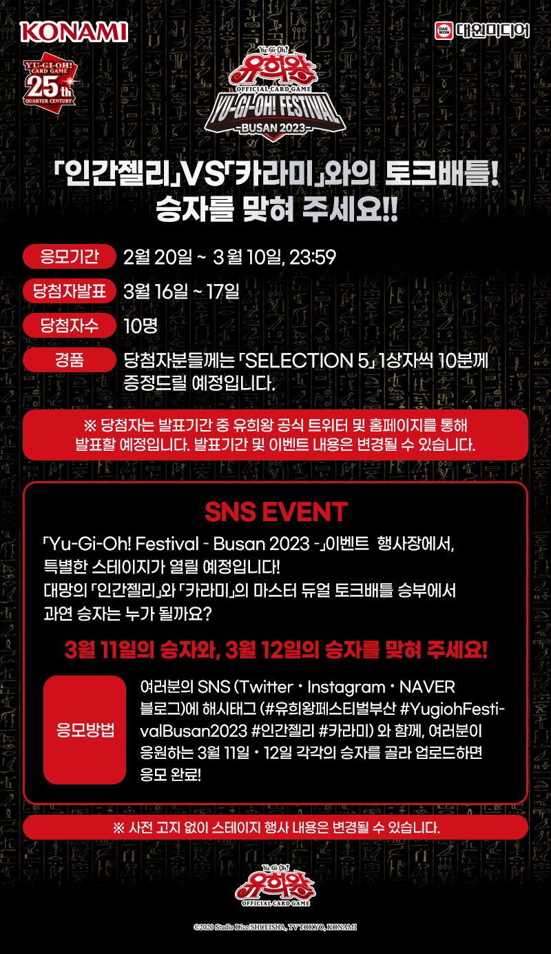 콘텐츠 기업 대원미디어는 23일, 다가오는 3월 11일과 12일 양일간 부산 벡스코에서 ‘유희왕 페스티벌 부산 2023’ 행사를 개최한다고 전했다. 이번 행사는 유희왕 IP의 상징적인 명대사로 자리잡은 ‘It’s Time to Duel!’을 슬로건으로 내걸었으며, 국내에서 개최된 유희왕 관련 오프라인 행사로는 역대 최대의 규모로 개최될 예정이다.