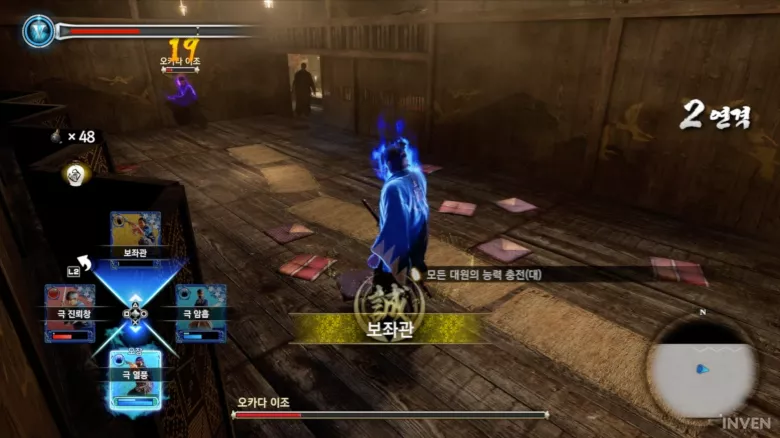 그래도 검을 맞대고 제대로 된 공격에 피가 뿜어지는 무사들의 전투 자체를 구현한 부분은 본가 용과 같이와는 분명 다른 맛과 재미를 내고 있습니다. 그것과는 별개로 아쉬움만을 남긴 점이라면 록온과 비슷한 기능이 있긴 하지만 이동에 따라 상대보다는 내 이동 방향을 잡아 조작이 번거로운 카메라 시점 정도일까요?
