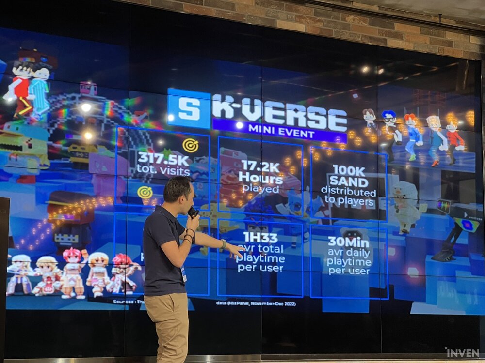 대표적인 프로젝트로는 케이버스를 들 수 있다. 지금까지 총 8만 명이 즐겼고 31만 명 이상이 케이버스를 방문했다. 유저당 평균 플레이 타임은 1시간 33분에 달한다. 이러한 지표를 설명하면서 세바스티앙 COO는 여러모로 의미 있는 지표로서 앞으로 더 사용자 친화적으로 나아가기 위해 노력하겠다고 설명했다.