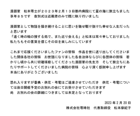 레이지사의 마츠모토 마키코 대표이사는 만화가 마츠모토 레이지가 향년 85세의 나이로 ‘별의 바다’를 향해 여행을 떠났으며, 고인을 기리는 영결식은 가까운 친척들만이 참석한 자리에서 거행됐다고 밝혔다. 그가 만화가로서 만화를 계속 그릴 수 있는 행복한 삶을 살았다고 전한 마키코 대표는 생전 고인이 남긴 “멀리 시간의 고리가 닿는 곳에서 다시 만날 수 있다”라는 말을 믿고, 그날을 기대하고 있다는 인사말을 전하기도 했다.