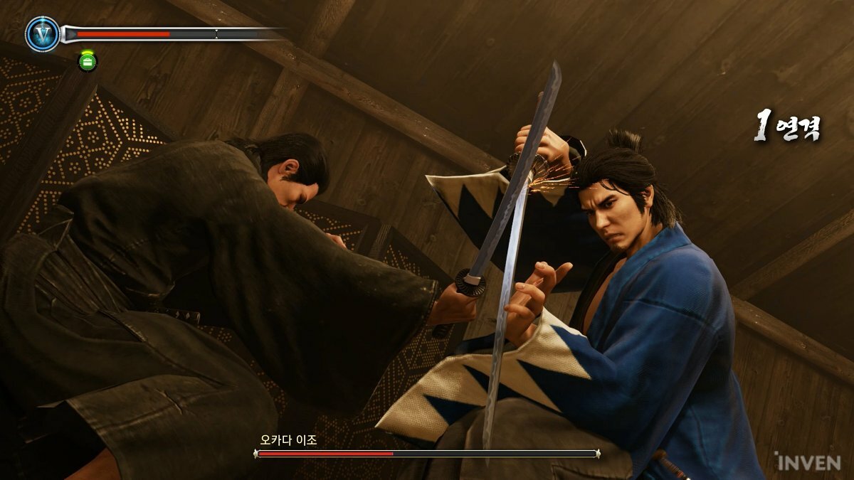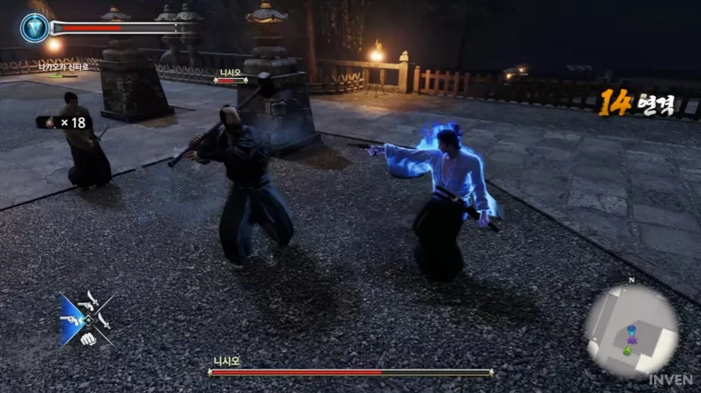 그래도 검을 맞대고 제대로 된 공격에 피가 뿜어지는 무사들의 전투 자체를 구현한 부분은 본가 용과 같이와는 분명 다른 맛과 재미를 내고 있습니다. 그것과는 별개로 아쉬움만을 남긴 점이라면 록온과 비슷한 기능이 있긴 하지만 이동에 따라 상대보다는 내 이동 방향을 잡아 조작이 번거로운 카메라 시점 정도일까요?