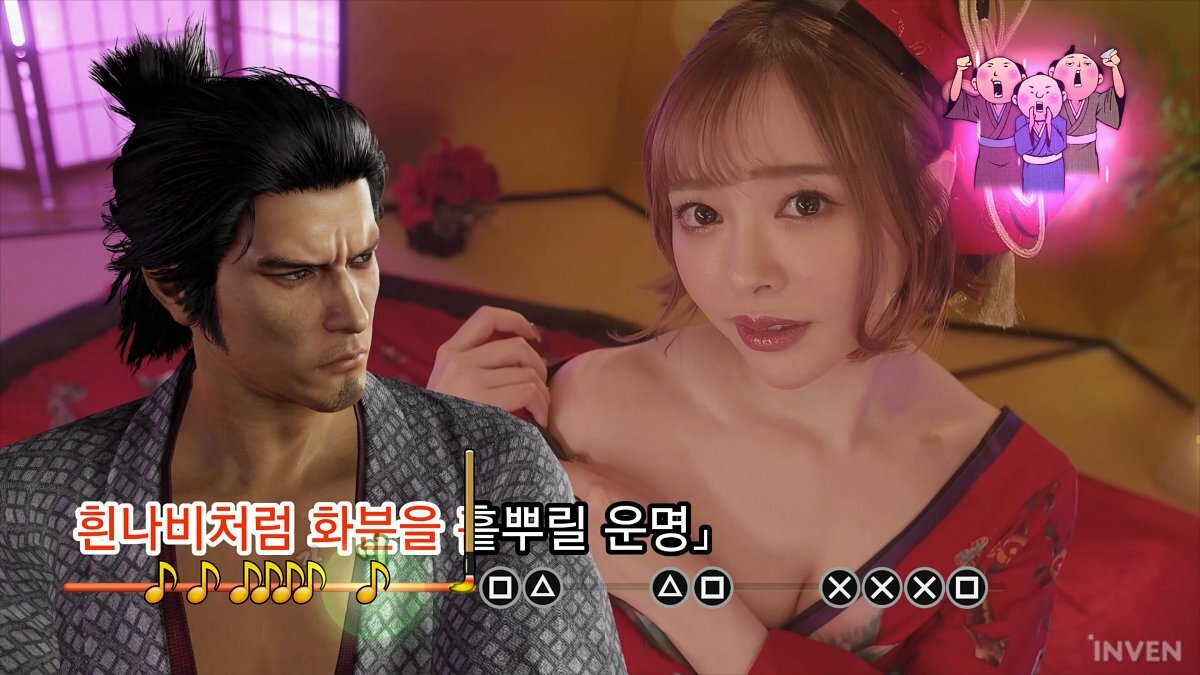 이런 플레이 스팟은 가라오케의 실사 뮤직비디오가 추가된 곡 ‘순정 무사’ 정도를 빼면 최대한 원작 그대로를 담았습니다. 그리고 이런 여러 콘텐츠와 서브 퀘스트는 용과 같이 시리즈가 자랑하는, 미국 화장실 유머와는 분명하게 구분되는 일본식 성인 개그가 잔뜩 담겨 있죠.