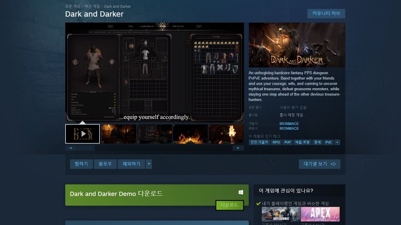 ‘다크 앤 다커(Dark and Darker)’는 2021년 하반기에 신설된 아이언메이스(IRONMACE)라는 한국 인디 개발사에서 개발 중인 첫 작품이다. 작년 하반기부터 특정 기간마다 데모 플레이를 할 수 있었으며, 현재 네 번째 데모 플레이가 진행 중이다.