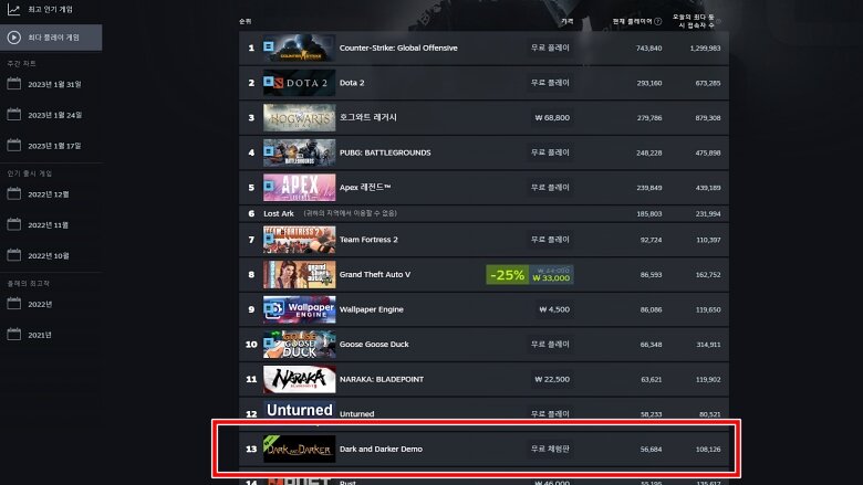 다크 앤 다커는 글로벌 서버로 동시 운영 중이다 보니 한국뿐만 아니라 미국, 대만, 일본, 독일, 러시아 등 다양한 국가의 유저가 게임을 즐기고 있다. 현재 스팀 최대 플레이 게임 순위 기준 10위권에 안착했으며 계속 유지 중이다. 별다른 홍보도 없이 단기간 열리는 데모 게임임에도 엄청나게 순항 중인 것을 확인할 수 있었다.