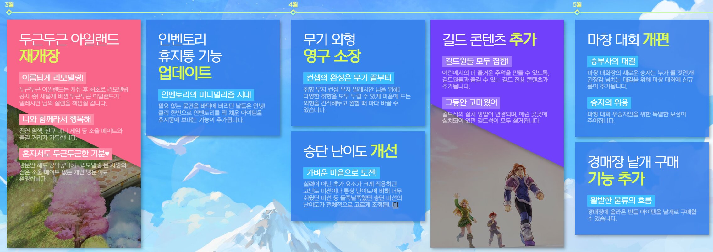 4월 계획에는 취향에 맞는 무기 외형을 영구적으로 소장하고, 원할 때마다 무기의 외형을 바꿀 수 있는 기능을 추가하며, 난이도가 들쭉날쭉했던 승단 난이도를 전반적으로 고르게 하는 패치가 진행될 계획이다. 또한, 길드원과 함께 즐길 수 있는 길드 전용 콘텐츠 추가 등 길드 관련 콘텐츠 또한 업데이트를 예정하고 있다. 다만, 길드석 설치 방법 변경에 따라 4월 업데이트 후 기존 길드석은 모두 철거될 예정이다.