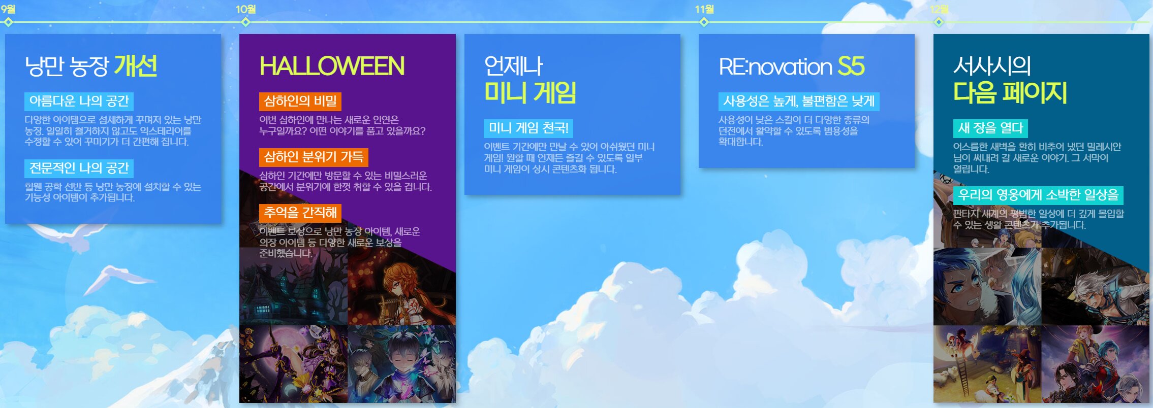 이후 9월에는 자신만의 농장을 꾸리는 콘텐츠인 ‘낭만 농장’ 개선을 목표로 업데이트가 이뤄지며, 보다 간편하게 농장을 꾸미고, 활용할 수 있도록 각종 편의성과 신규 기능성 아이템이 추가될 예정이다.