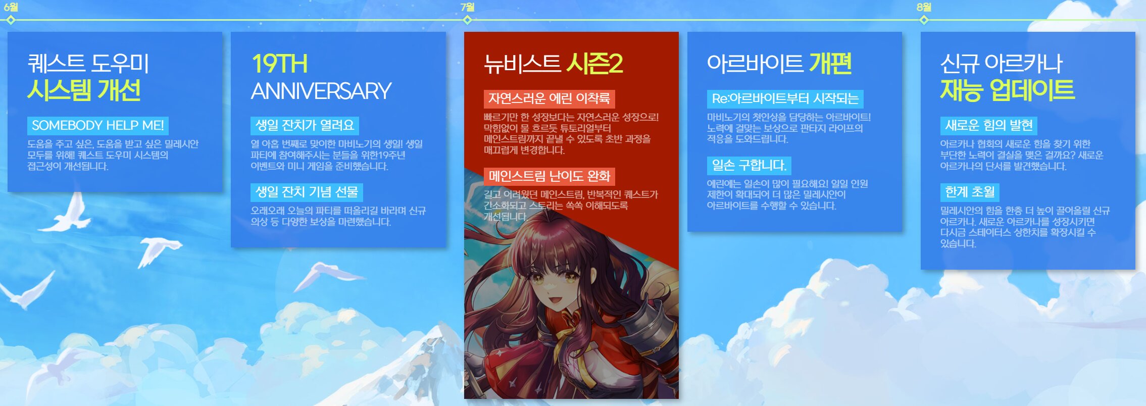 여름 시즌을 준비하기 시작하는 7월에는 튜토리얼부터 게임 정착까지 신규 이용자의 적응을 돕는 ‘뉴비스트’ 시즌2를 계획하고 있다. 그간 지적되어 온 퀘스트의 길이와 반복적인 임무들이 간소화되며, 난이도 또한 완화해 신규 이용자들이 보다 편하게 게임을 즐길 수 있도록 할 계획이다. 또한, 마비노기 특유의 ‘아르바이트’ 시스템을 개편해 보다 많은 이용자가 노력에 걸맞는 보상을 제공한다는 것이 업데이트 계획이다.