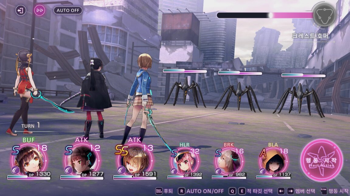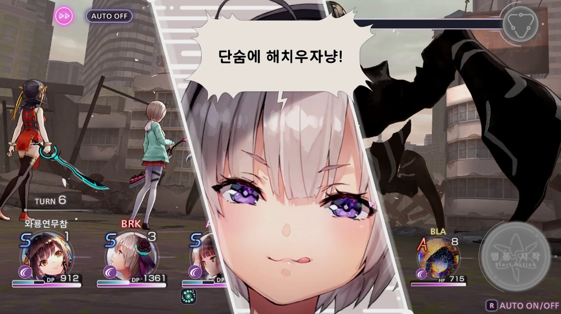 우선 ‘헤븐 번즈 레드’의 전투는 어나더 에덴과 유사하게 전열, 후열로 나뉩니다. 어나더 에덴과 달리 전열3에 후열 3에, 체인지 스킬은 없지만 전투 중에 아이템 사용이 불가능하기 때문에 상황을 봐서 전열과 후열 캐릭터를 교체투입해야 한다는 점도 비슷하죠. 아군과 적이 페이즈 단위로 턴을 주고 받는 클래식한 방식에, 기본 공격과 액티브 스킬로 이원화된 고전적인 심플한 턴제 전투도 유사합니다.
