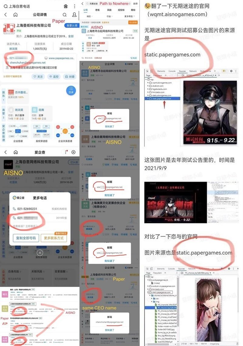이 뿐만이 아니다. 두 게임사의 중국 본사 전화번호가 021-****-0012로 일치한다는 점, 과거 ‘무기미도’의 중국내 CBT 이미지 출처가 페이퍼게임즈였다는 점, 마찬가지로 메일 주소 역시 xier***@papegames.net으로 일치한다는 점 등을 들면서 유저들의 의혹은 확신에 가깝게 변하고 있다.
